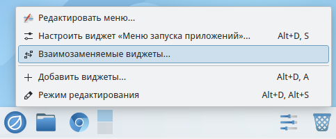 Более того, все рабочее пространство в ОС изначально состоит из виджетов, которые можно заменить другими. Например, если не устраивает главное меню ОС, его можно заменить на другое, выбрав его из контекстного меню стартовой кнопки "Взаимозаменяемые виджеты". Для доступа к контекстному меню нужно нажать правой кнопкой "мыши" на кнопку главного меню (Рисунок 25).