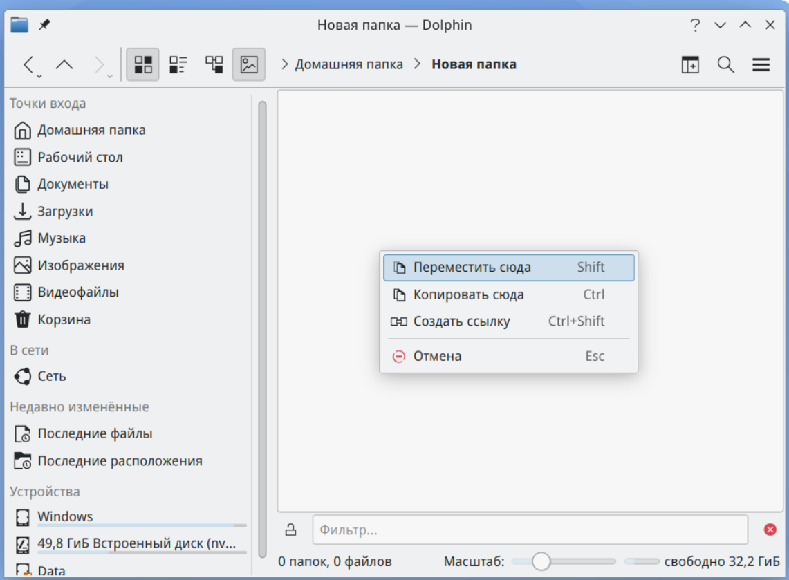 Также можно копировать и перемещать файлы и папки путем перемещения с использованием зажатой правой кнопки "мыши" в другую папку или на съемный носитель. При переносе появится контекстное меню, в котором необходимо выбрать действие "Копировать сюда" или "Переместить сюда" (Рисунок 64).