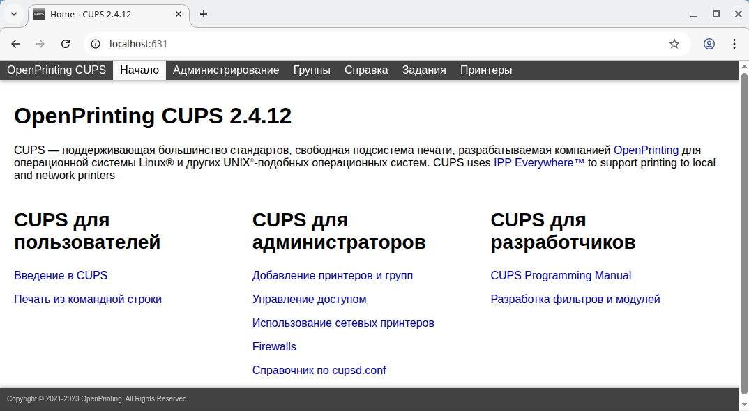 Для добавления принтера может использоваться веб-интерфейс CUPS, который доступен по адресу http://localhost:631. Этот интерфейс позволяет управлять принтерами, просматривать очередь печати и настраивать параметры сервера (рисунок 27).