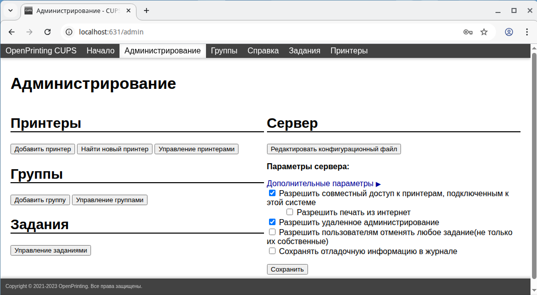 - Открыть веб-интерфейс CUPS по адресу
