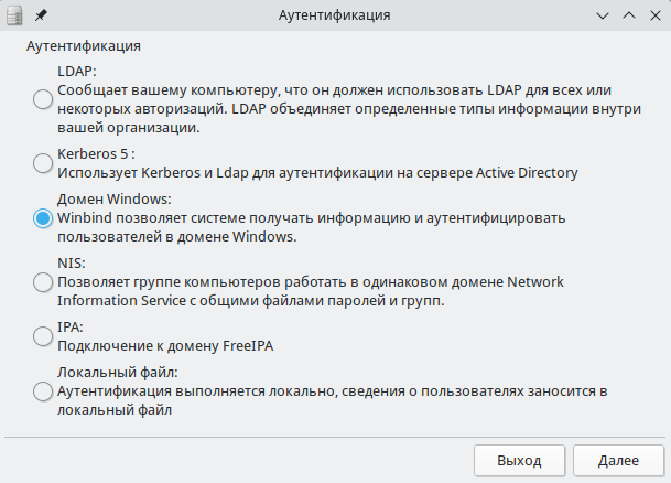 Рисунок 16 – Выбор способа аутентификации в графическом интерфейсе drakauth
