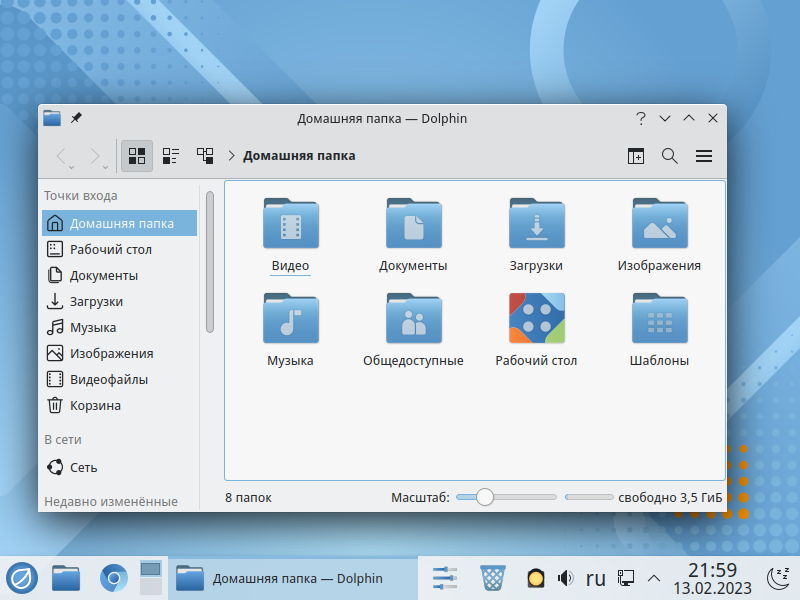 Вид рабочего стола KDE имеет привычный для пользователя интерфейс. На рабочем столе можно размещать файлы и каталоги.