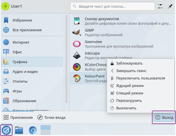 - Завершить сеанс – завершает текущий сеанс пользователя с переходом к окну авторизации ОС для выбора другой учетной записи;