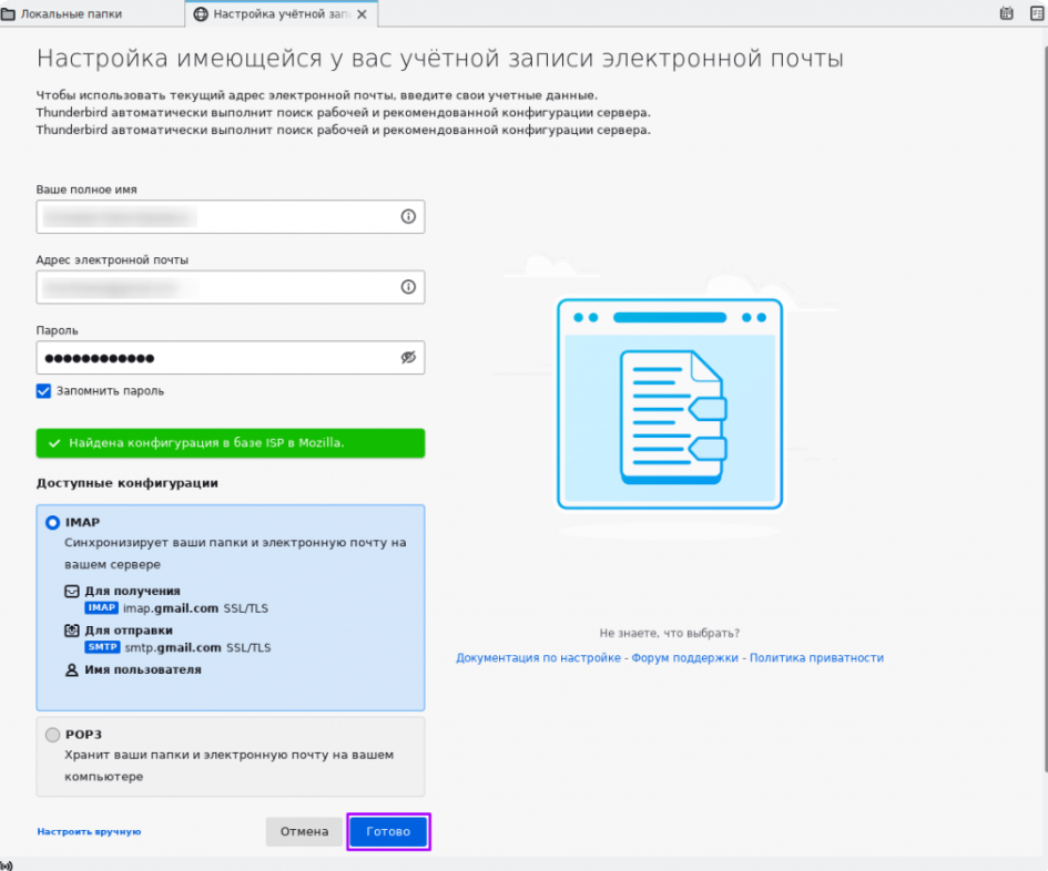 При первой загрузке приложения необходимо внести необходимую информацию о пользовательском почтовом ящике и его конфигурации. В настройках учетной записи нужно ввести фамилию, имя, отчество, адрес электронной почты и пароль. Если данные введены корректно, появится сообщение "Найдена конфигурация в базе ISP в Mozilla" (Рисунок 52).