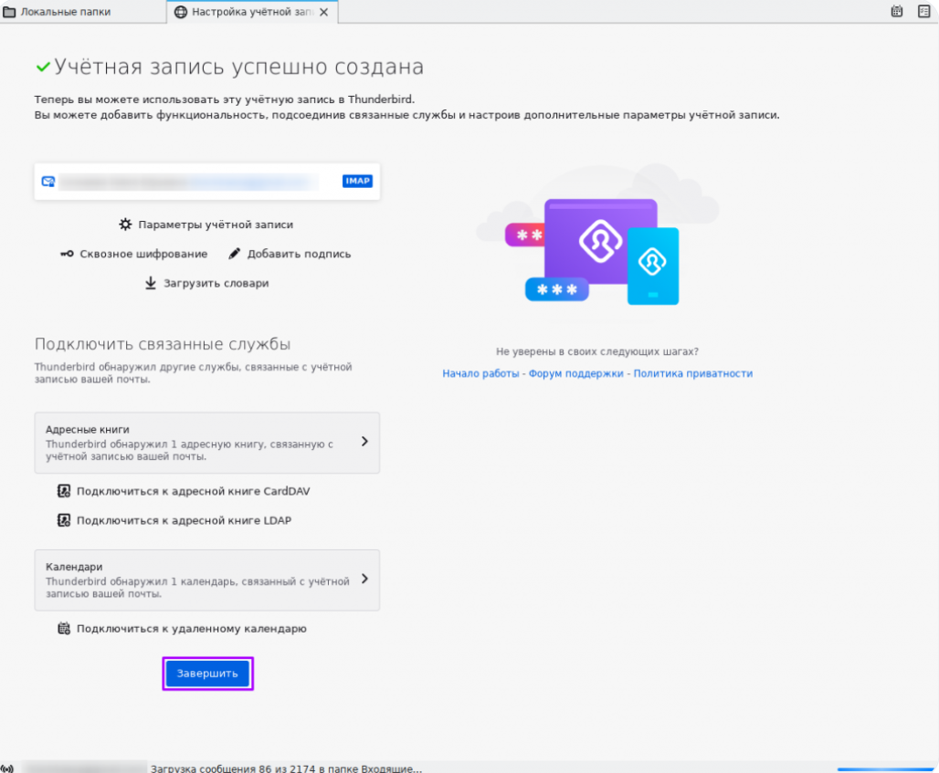Для завершения настройки учетной записи следует нажать кнопку Завершить (Рисунок 53).