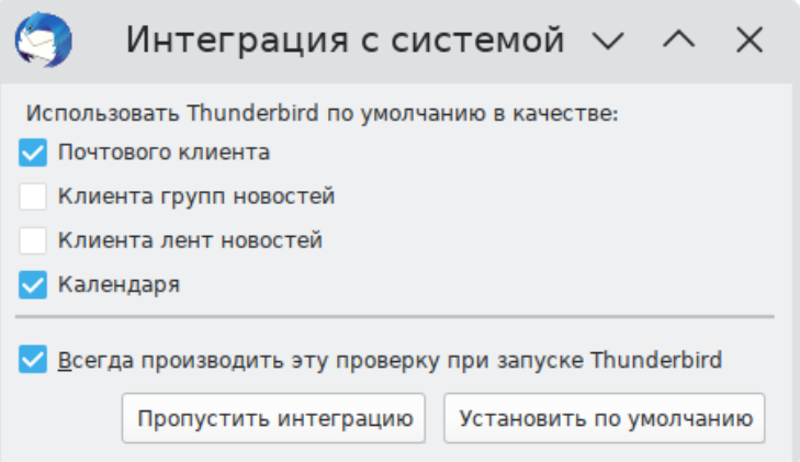 Также можно установить клиент Thunderbird в качестве почтового клиента, календаря или ленты новостей по умолчанию. Если нет необходимости производить интеграцию с Системой, нажимают кнопку Пропустить интеграцию (Рисунок 54).