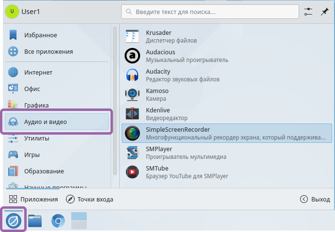 Чтобы открыть установленное приложение в главном меню, выберите "Аудио и видео → SimpleScreenRecorder" (Рисунок 71).