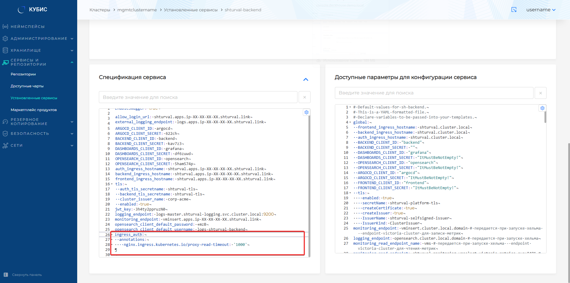 - в кластере управления перейти в раздел "Сервисы и репозитории" на станицу "Установленные сервисы". На вкладке "shturval" найти "Модуль программного управления Комплексом" (shturval-backend), перейти к управлению модулем. В блоке "Спецификация сервиса" добавить аннотацию с необходимым временем тайм-аута.