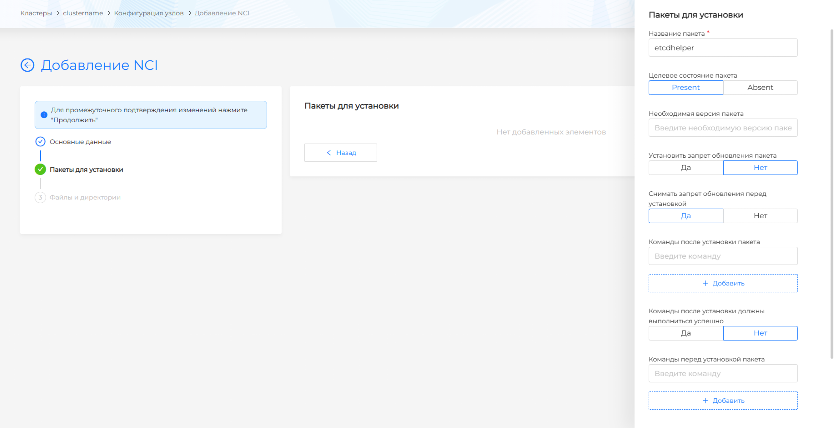 - в открывшемся окне на шаге конфигурации раздела "Пакеты для установки" нажать