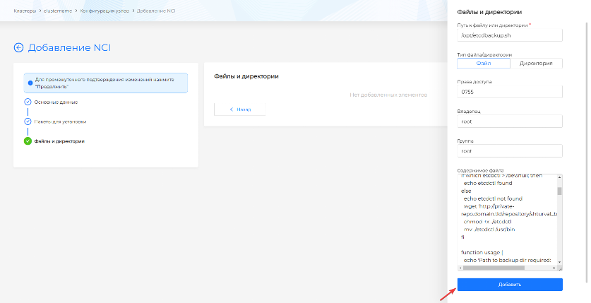 0755, что обеспечит владельцу полный доступ к файлу, группе владельца, другим пользователям ‒ доступ на чтение и выполнение. Владелец и группа должны быть root; - в поле "Содержимое файла" вставить содержимое подготовленного скрипта из файла "etcdbackup.sh", нажать