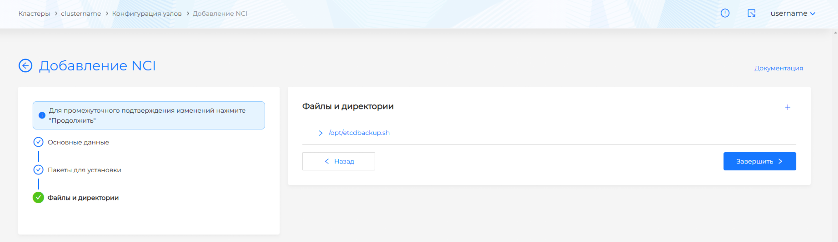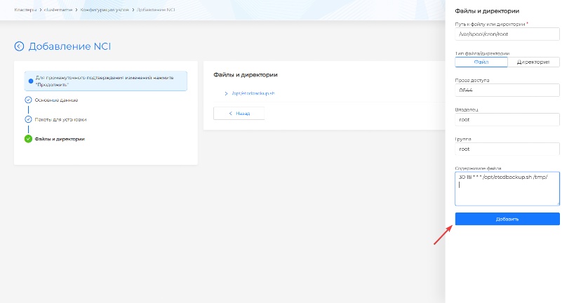 + Добавить NCI. На странице добавления NCI: - задать имя, например "etcdbackup", и в селекторе узлов из выпадающего списка выбрать ключ лейбла