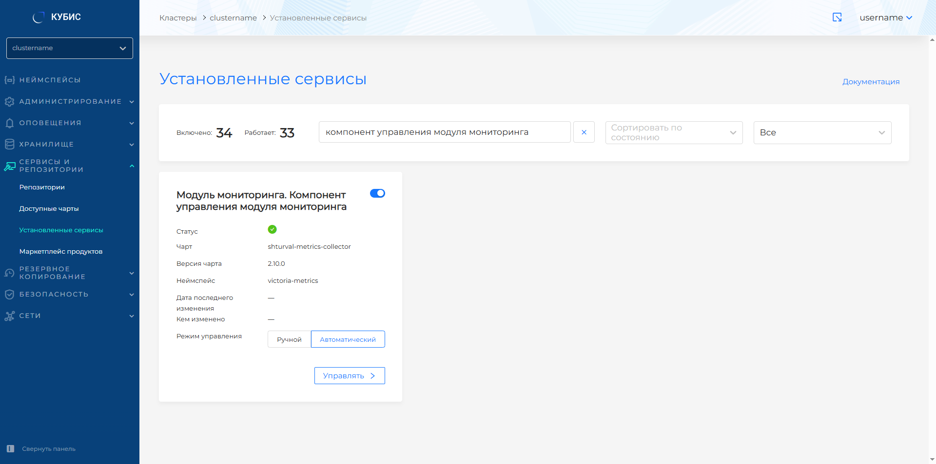 - в кластере в боковом меню открыть раздел "Сервисы и репозитории", перейти на страницу "Установленные сервисы", найти компонент управления модуля мониторинга (shturval-metrics-collector) (рисунок 124);