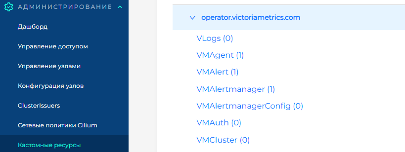 - в разделе "Администрирование" бокового меню кластера перейти на страницу "Кастомные ресурсы". В API-группе "operator.victoriametrics.com" найти ресурс VMAlertmanager и проверить, что он имеет