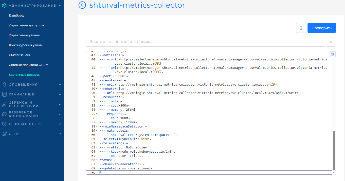 updateStatus: operational. - в разделе "Администрирование" бокового меню кластера перейти на страницу "Кастомные ресурсы". В API-группе "operator.victoriametrics.com" найти ресурс VMAlert и проверить, что он имеет статус