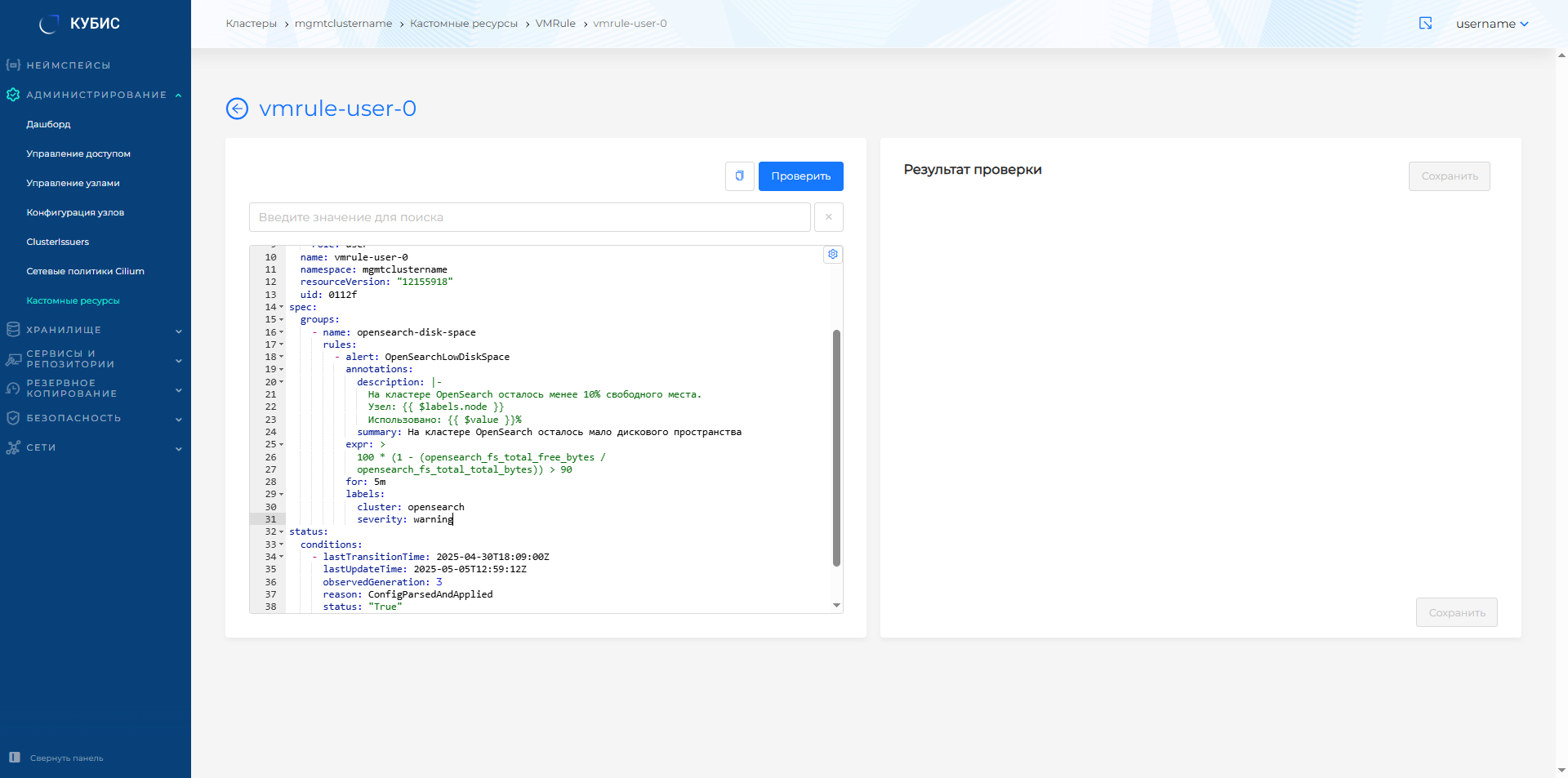 - в графическом интерфейсе кластера управления в разделе "Администрирование" перейти на страницу "Кастомные ресурсы", найти группу "operator.victoriametrics.com", перейти к списку кастомных ресурсов VMRule, открыть манифест кастомного ресурса "vmrule-user-0" и добавить правило проверки в блок "groups".