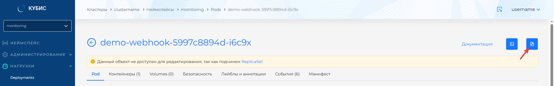 - в неймспейсе "monitoring" кластера перейти к просмотру пода с именем