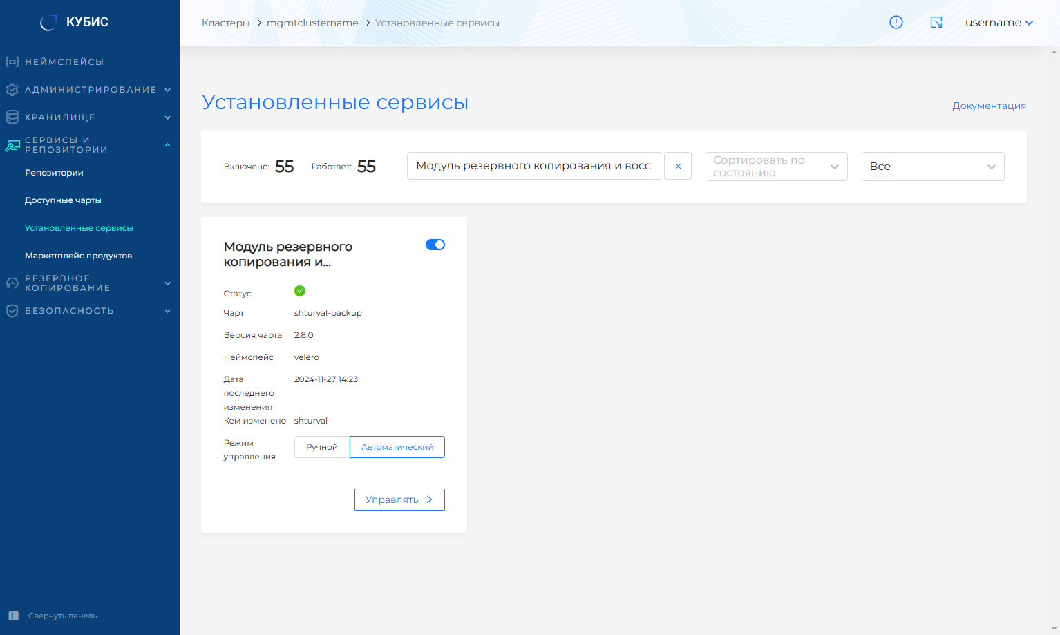 - установить модуль резервного копирования и восстановления ("Velero") в режиме "Автоматический" (auto) (рисунок 53);