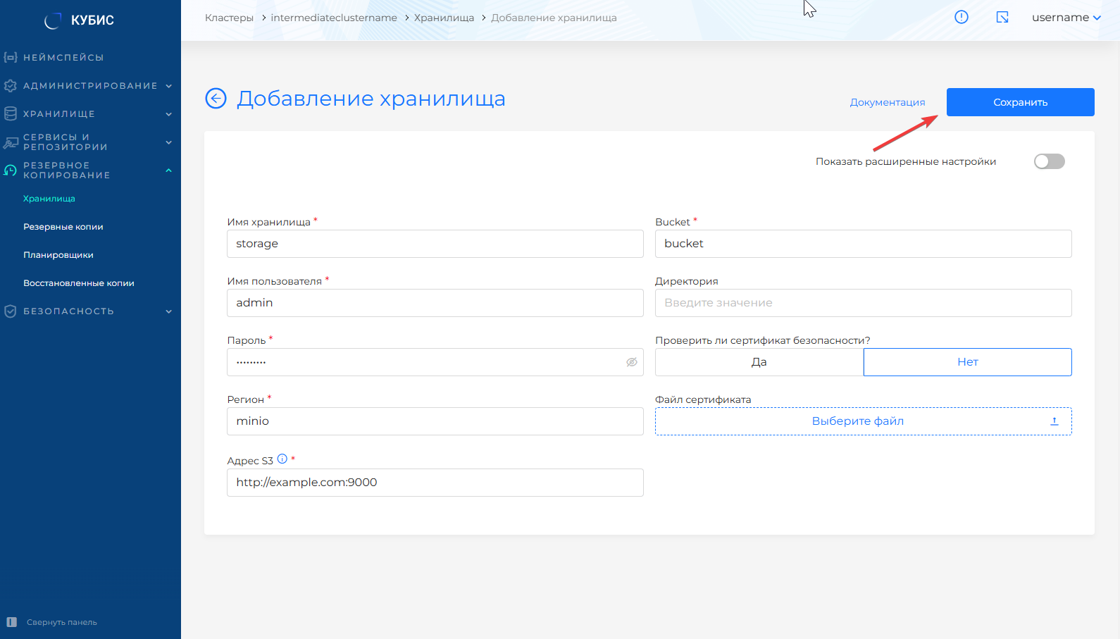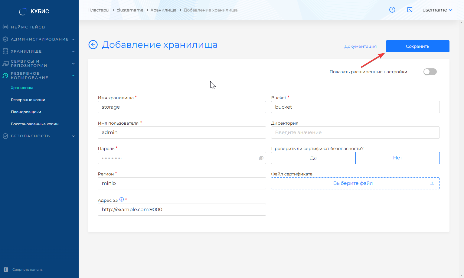 - настроить доступ к S3-хранилищу с помощью интерфейса резервного копирования и восстановления в кластере управления(рисунки 48 и 49);