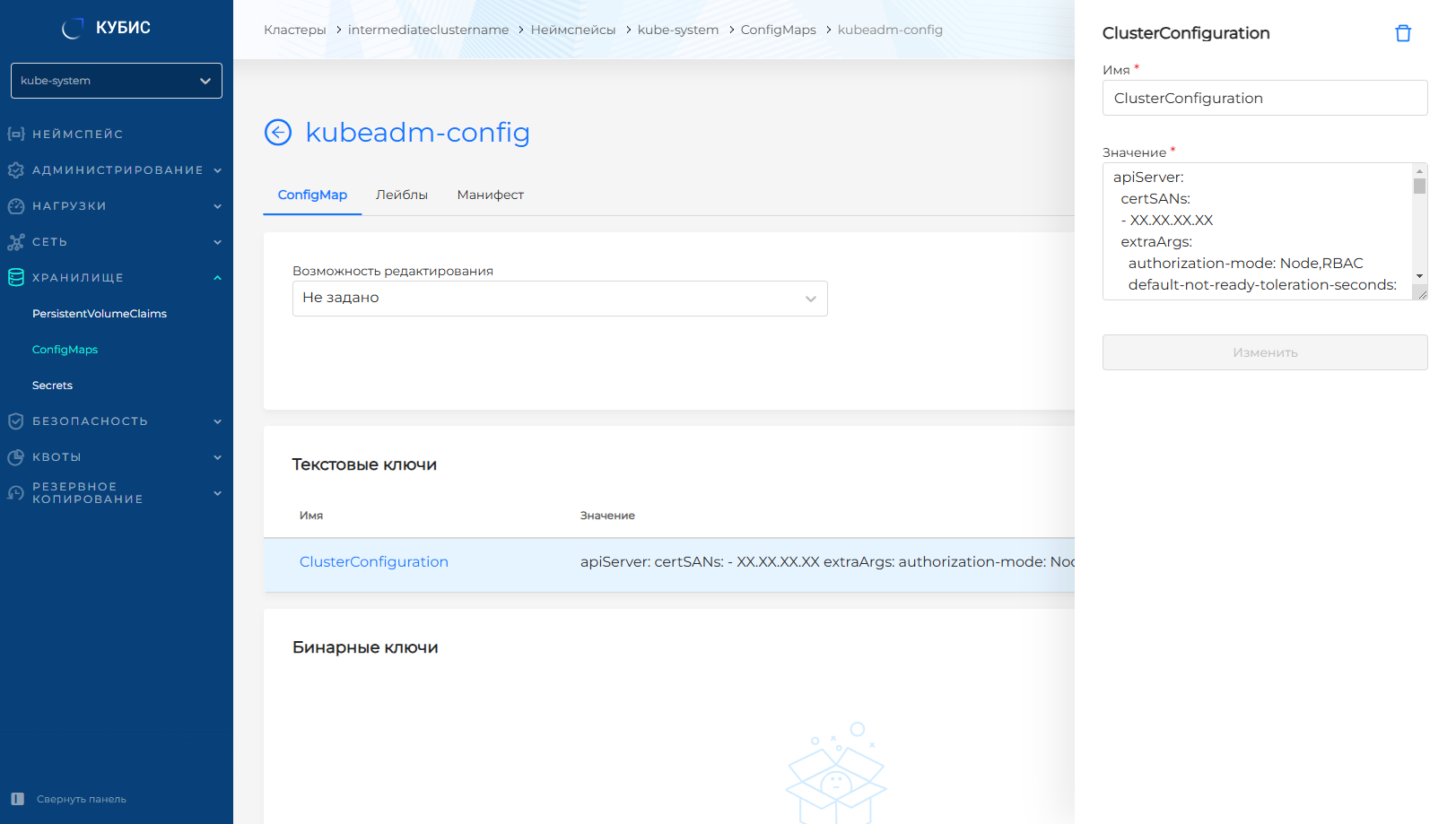 Configmap kubeadm-configнеймспейса "kube-system" (рисунок 67);