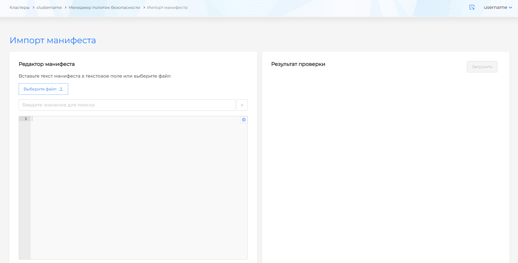 Для добавления политики нужно перейти в интерфейс импорта манифеста и вставить необходимые политики, затем нажать Проверить. После успешного прохождения проверки необходимо нажать Загрузить.