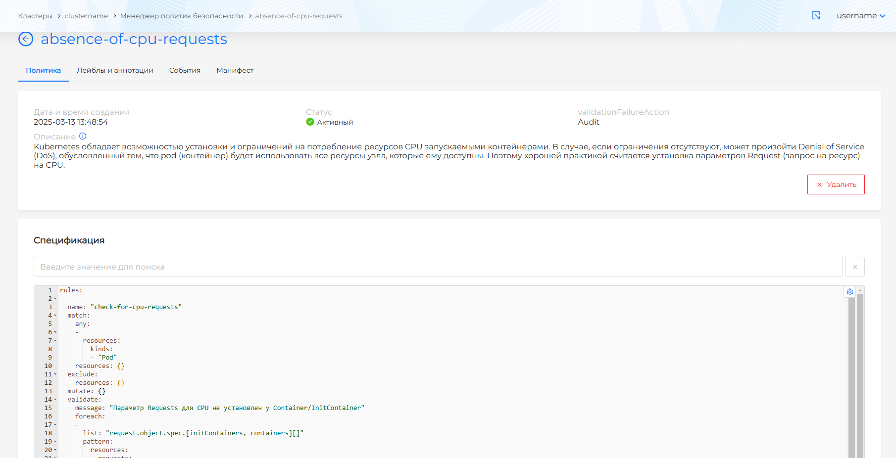 На странице просмотра политики (рисунок 380) есть четыре вкладки: "Политика", "Лейблы и аннотации", "События", "Манифест".