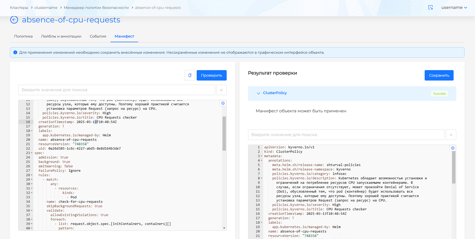 Политику безопасности можно изменить с помощью YAML-манифеста, перейдя на вкладку "Манифест" и внеся изменения. После изменения манифеста следует нажать Проверить и в правой части экрана отобразится результат проверки. Можно раскрыть блок результата проверки, чтобы увидеть полный манифест (рисунок 381).