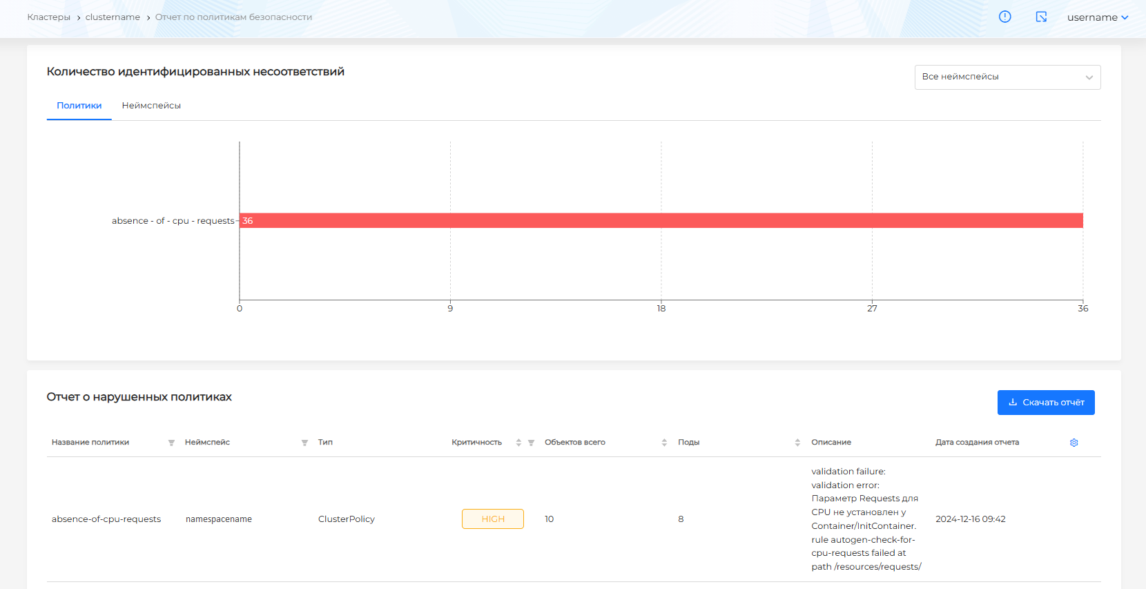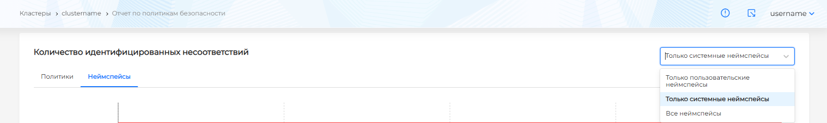 Дополнительно для отчета по политикам безопасности доступна фильтрация по системным или пользовательским неймспейсам. По умолчанию представлен отчет по всем неймспейсам. Чтобы отфильтровать неймспейсы, нужно в правом верхнем углу из выпадающего списка выбрать необходимый фильтр (рисунок 384).