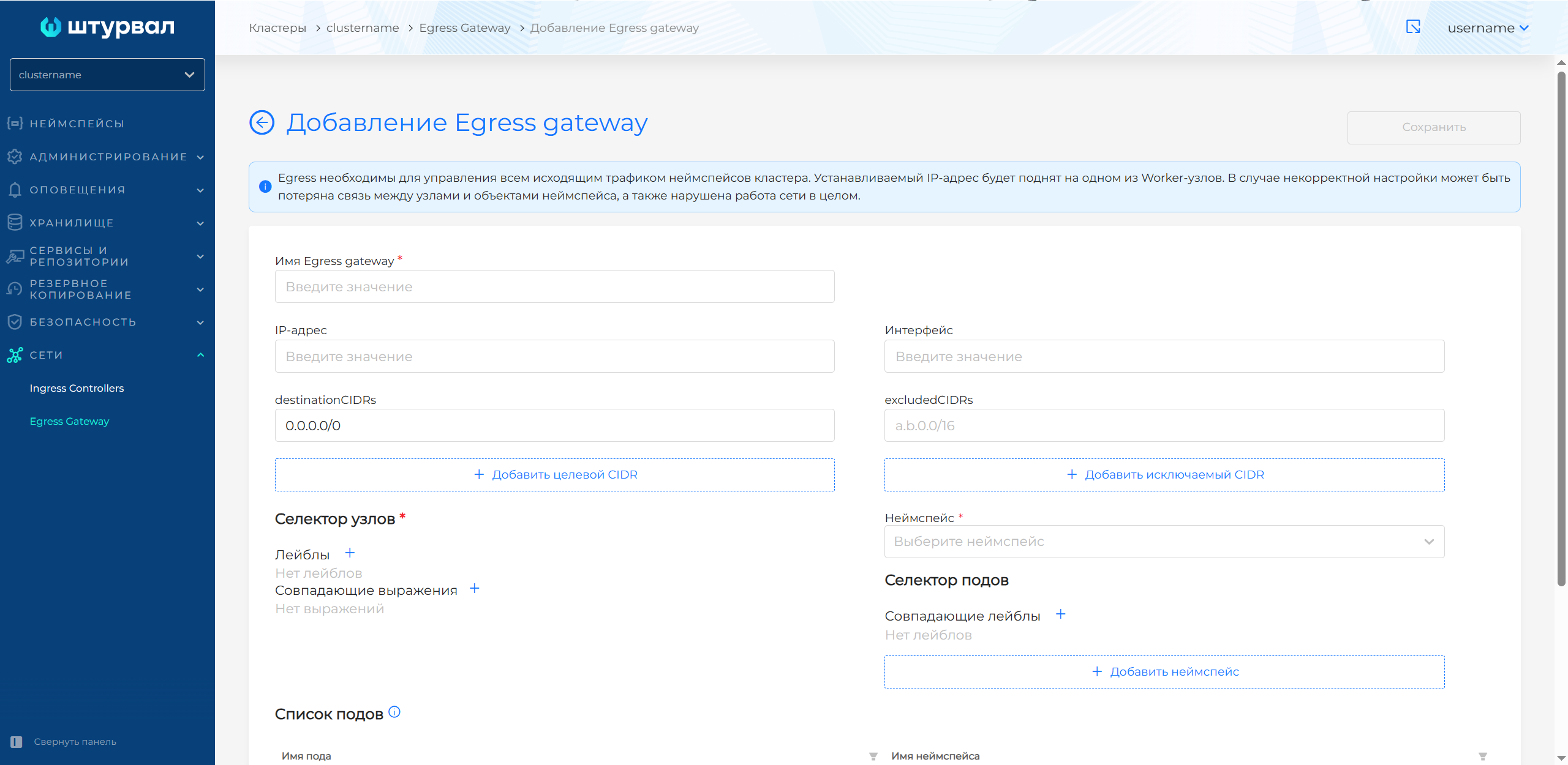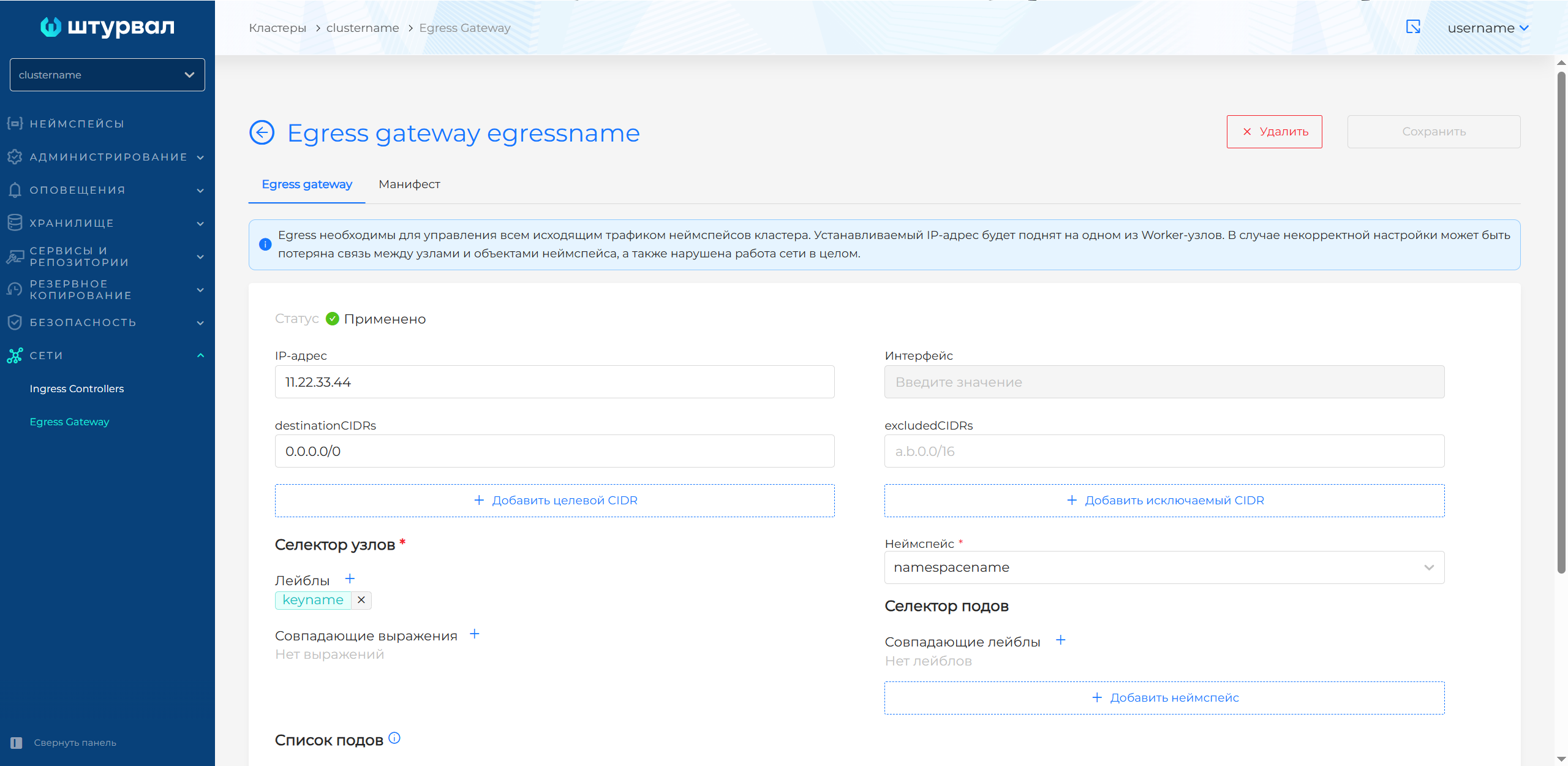 В случае если заданному набору условий (лейблы, выражения) соответствует несколько Worker-узлов, будет использован первый узел в лексическом порядке. Необходимо нажать Сохранить, чтобы завершить создание "Egress Gateway".