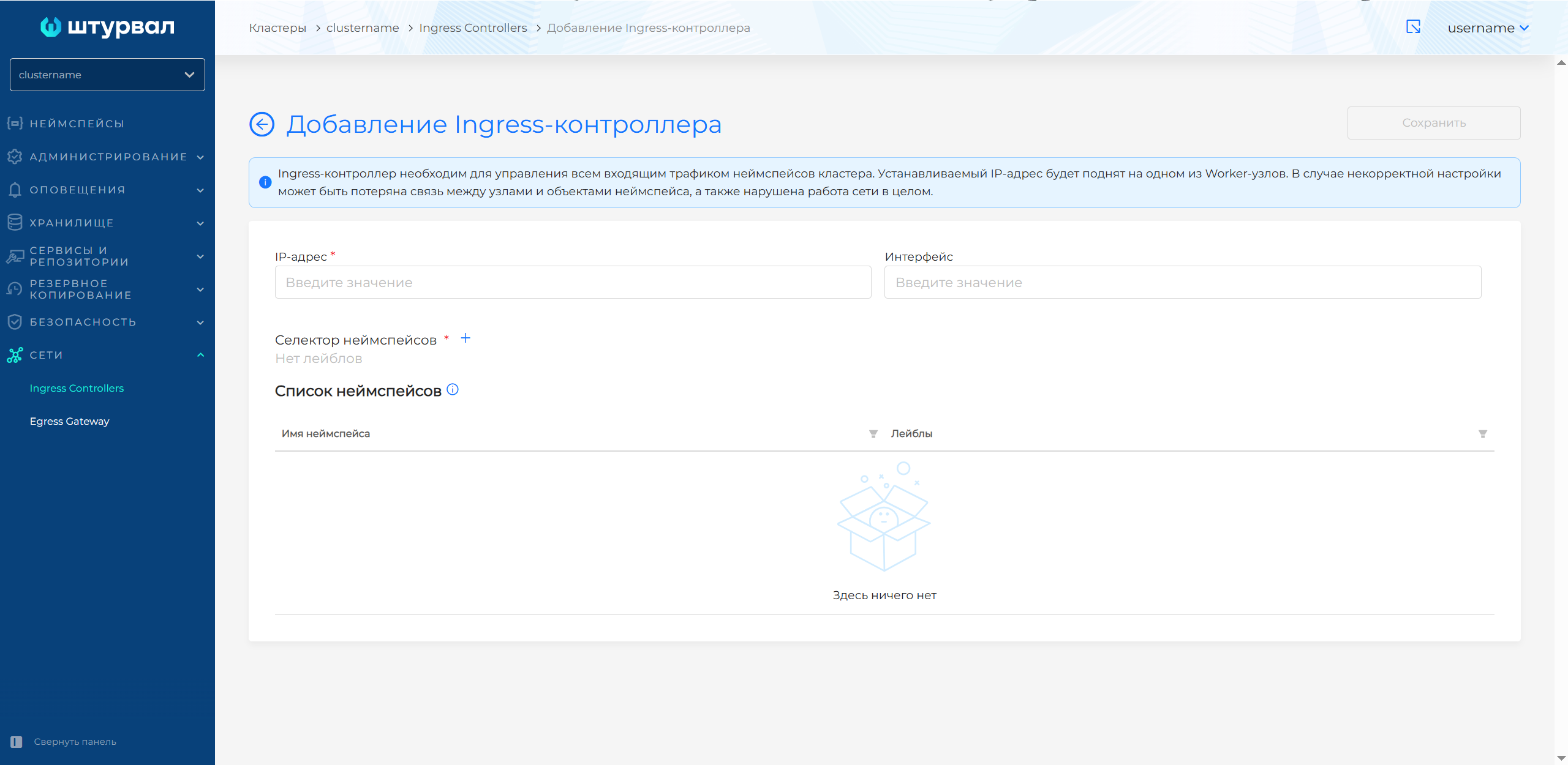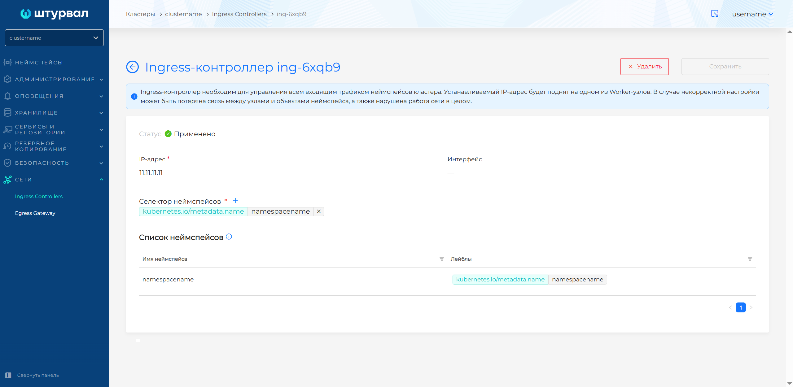 Если в конфигурации "Ingress Controller" задан определенный неймспейс, блок "Селектор неймспейсов" будет заменен на имя этого неймспейса. Такой неймспейс недоступен для редактирования.