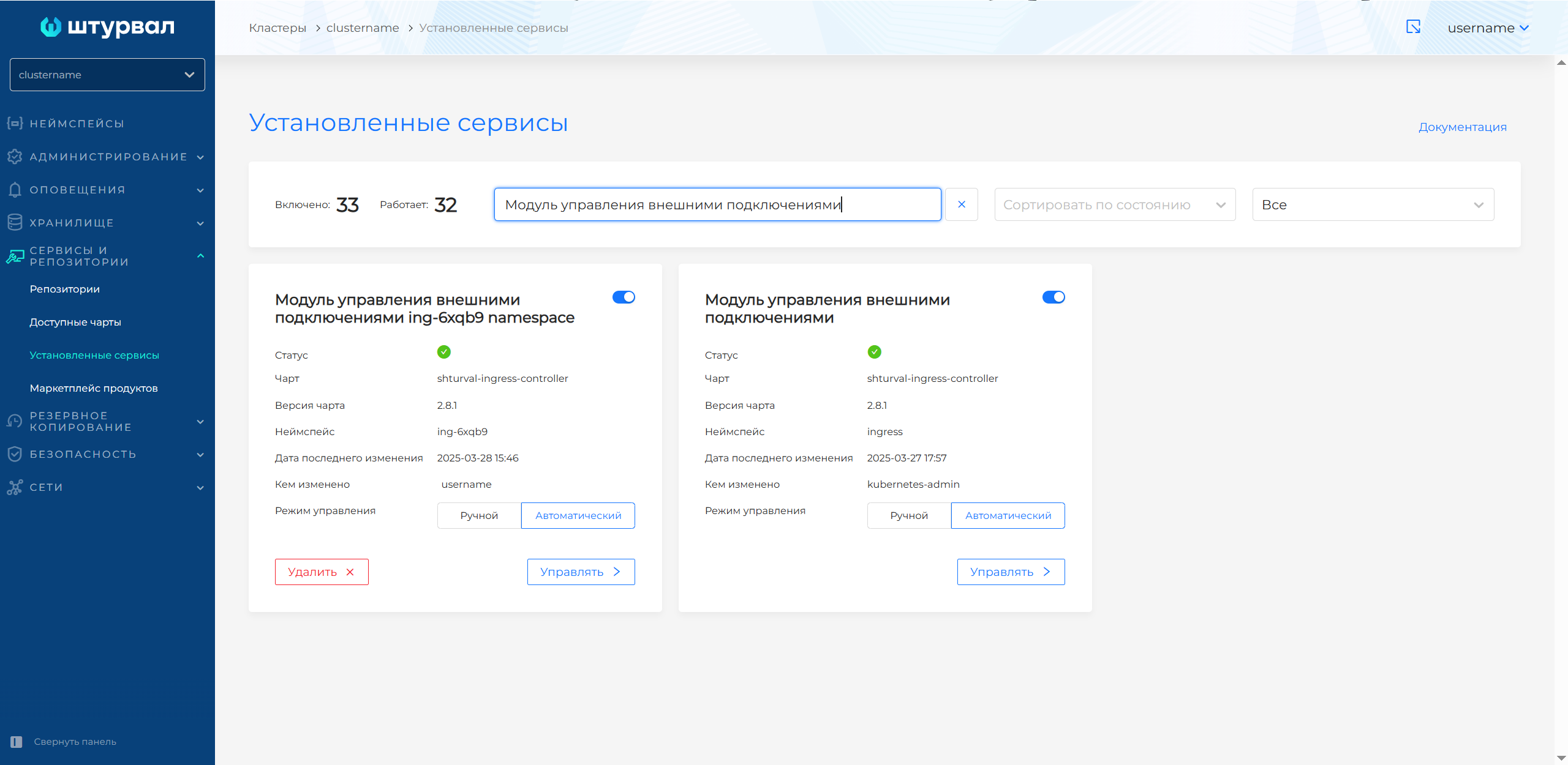 В установленных сервисах будет добавлен "Модуль управления внешними подключениями" с именем, соответствующим имени созданного неймспейса (рисунок 258).