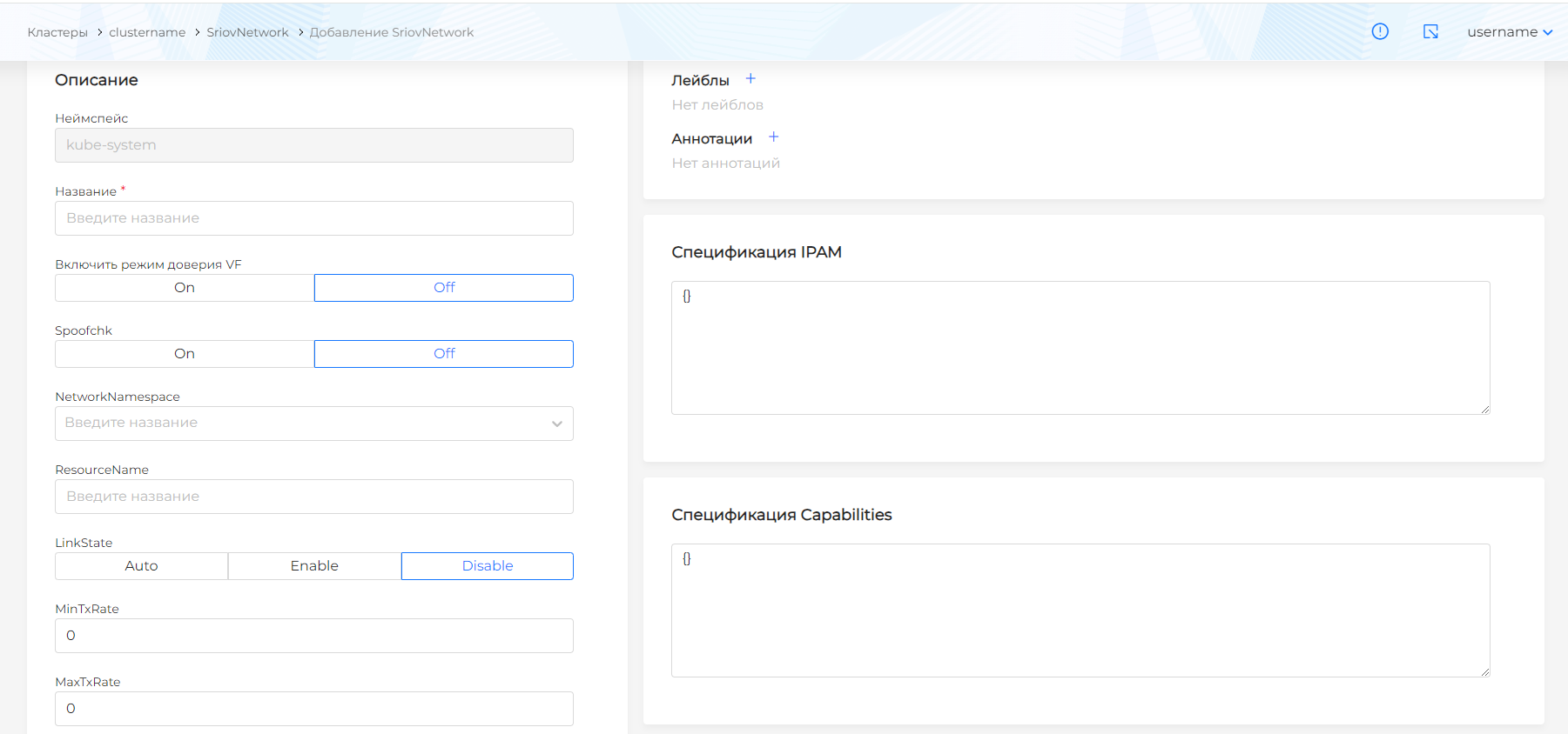 Название;ResourceName‒ соответствует ResourceName сетевой политики SriovNetworkNodePolicy;Спецификация IPAM‒ IP-менеджер SR-IOV. Определяет параметры сети, например, подсеть и диапазон внутренних IP-адресов. IPAM настраивается в формате JSON.Спецификация capabilities‒ настраивается в формате JSON.vlan‒ (опциональный параметр) идентификатор VLAN.spoofChk‒ параметр для включения или отключения проверки поддельности.Включить режим доверия VF‒ (опциональный параметр) Указывает, должен ли VF доверять пакетам с потенциально вредоносным содержимым. Ограничение TX-скорости. Поля "maxTxRate" и "minTxRate" в объекте SriovNetwork указывают на наибольшую и наименьшую скорость передачи (в мегабитах в секунду). Допускается ограничивать только одно из значений:maxTxRate‒ максимальная TX-скорость;minTxRate‒ минимальная TX-скорость;linkState‒ текущее состояние связи VF. Принимает одно из значений:auto‒ состояние связи определяется драйвером сетевого интерфейса. Это значение по умолчанию.enable‒ сетевой интерфейс (VF) всегда включен, даже если PF не подключен к сети. При этом будут доступен исходящий трафик (инициализированный с VF), но входящий трафик от PF будет недоступен.disable‒ VF всегда выключен, независимо от состояния PF.- networkNamespace ‒ неймспейс, в котором будет создана сеть.
