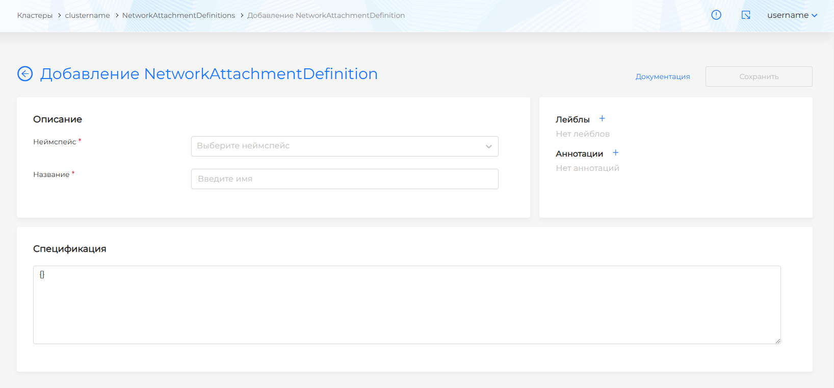 Затем требуется задать название ресурса и выбрать неймспейс, в котором он будет использован. При необходимости можно задать лейблы и аннотации.