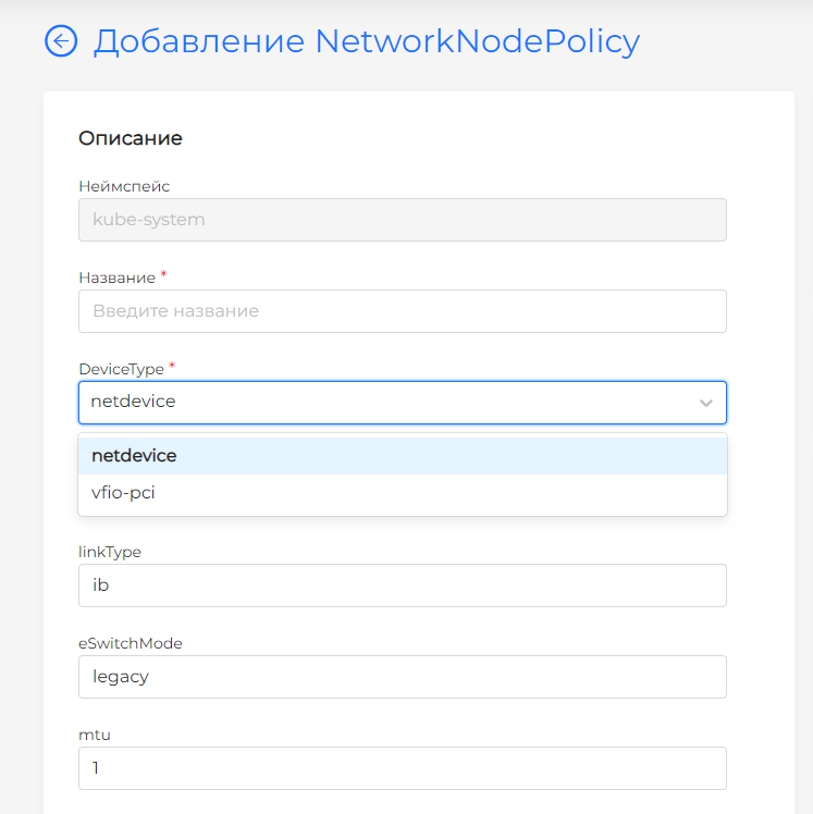 Название;ResourceName‒ связывает сетевую политику "SriovNetworkNodePolicy" с сетью "SriovNetwork";Селектор узлов‒ определить, какие узлы охватываются политикой SR-IOV, используя лейблы узлов.Приоритет‒ приоритет применения политики SR-IOV. Если у узла есть несколько политик, то они применяются в соответствии с приоритетом.deviceTypes‒ тип драйвера для создаваемых VF. Возможные значения:- "netdevice" (драйвер в ядре Linux);