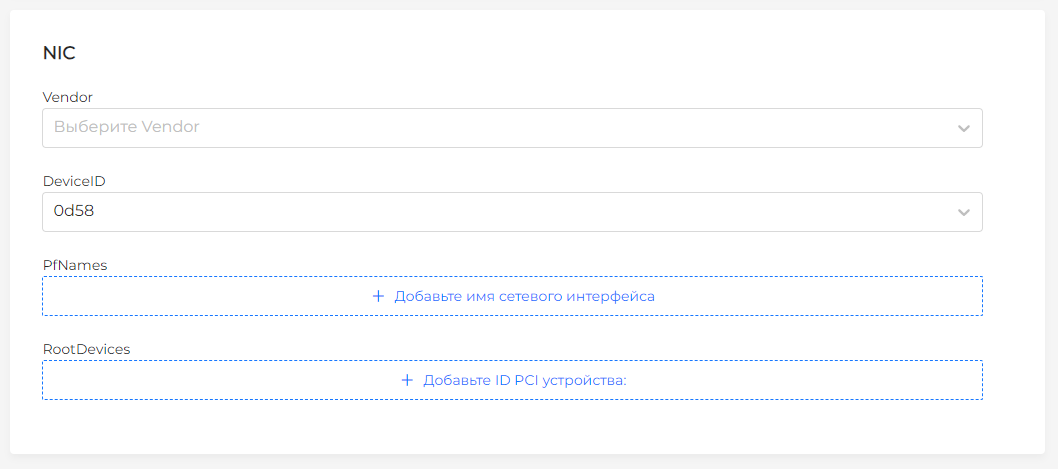 numVfs‒ количество виртуальных функций, которое должно быть настроено на каждом NIC.linkType‒ тип сетевого соединения. Возможные значения:- "Eth" ‒ описывает Ethernet-соединение;
