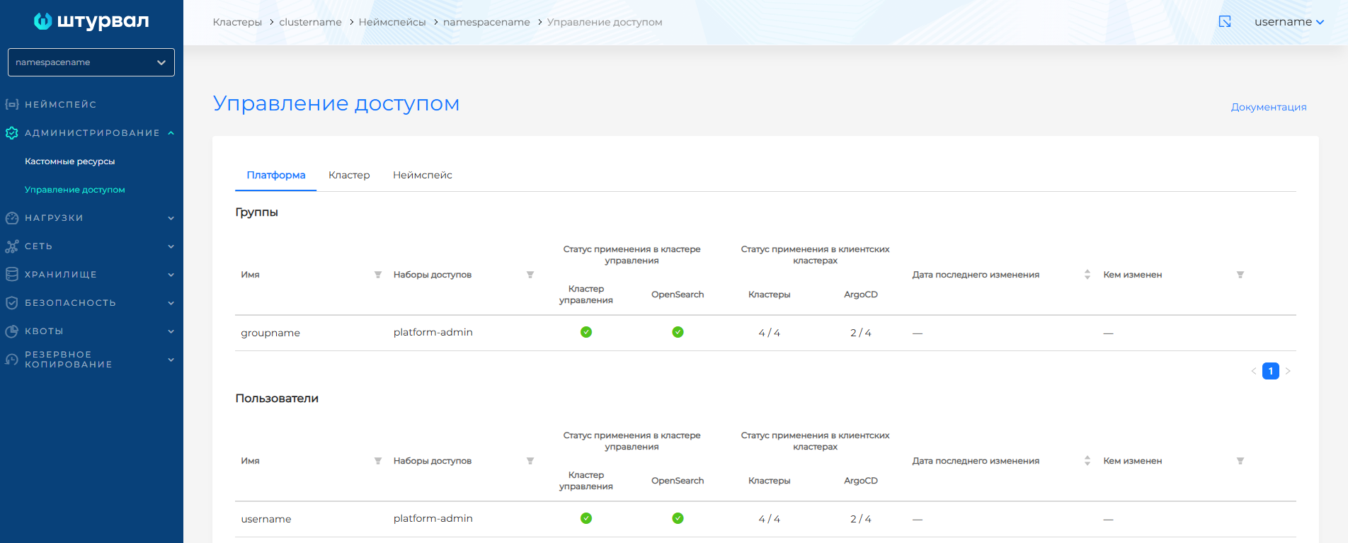 - просматривать перечень платформенных и кластерных назначений прав доступа для пользователей и групп, имеющих доступ к этому неймспейсу. Записи, доступные только для просмотра, некликабельны.