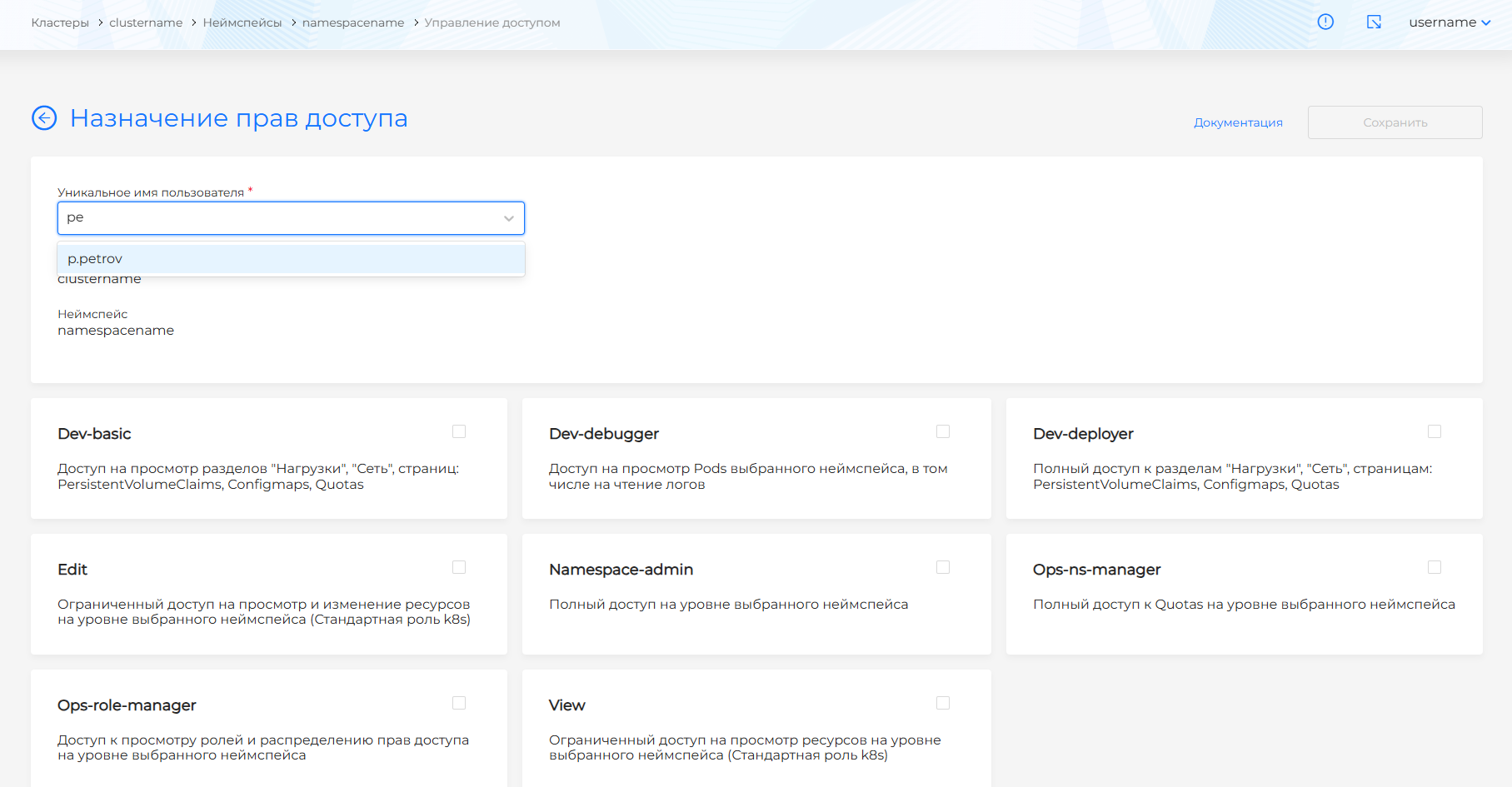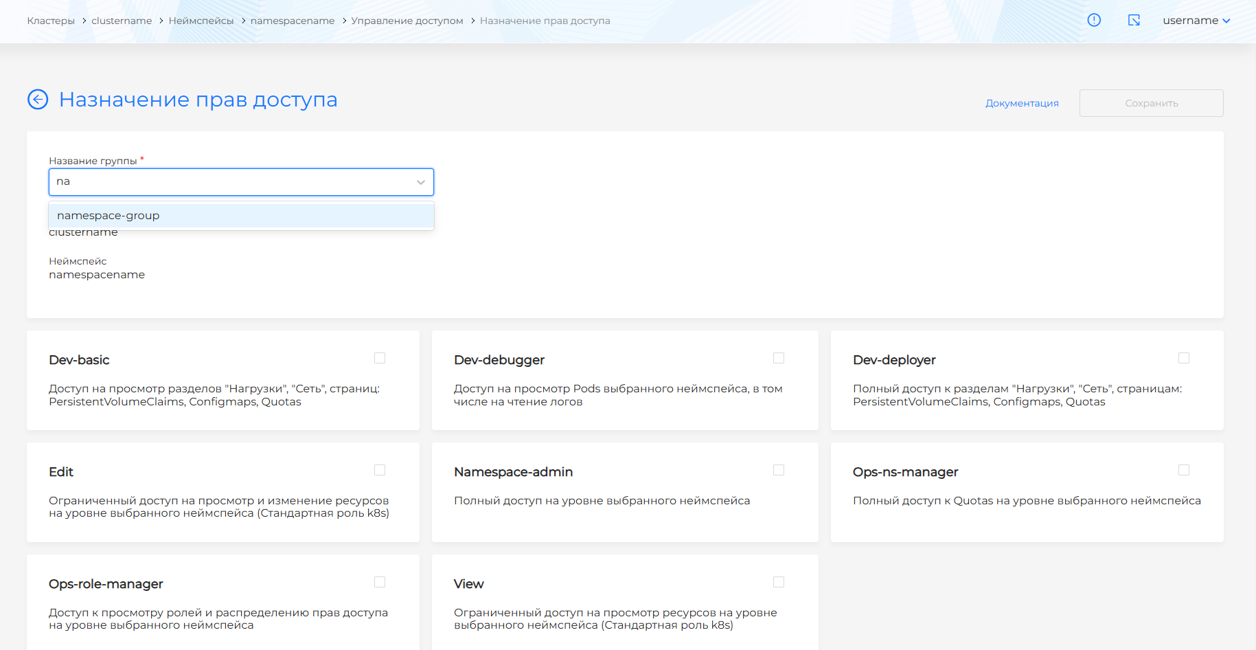 Назначение прав доступа пользователям/группе пользователей для неймспейса кластера можно произвести со страницы "Управление доступом" соответствующего неймспейса.