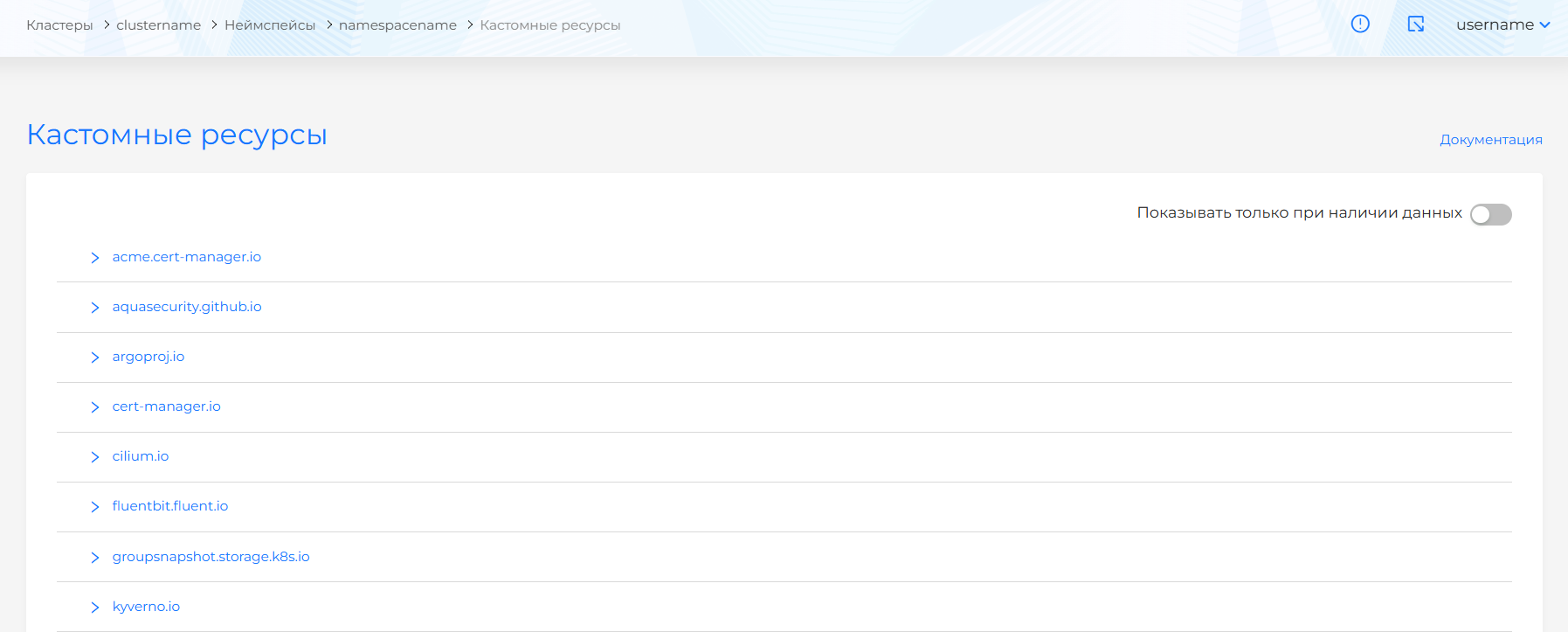 Можно управлять кастомными ресурсами (Custom Resource) в вашем неймспейсе. Для этого следует перейти на страницу "Кастомные ресурсы" раздела "Администрирование" (рисунок 270). Страница отображает список CRD, созданных в клиентском кластере и сгруппированных по API-группам. В списке отображено количество созданных кастомных ресурсов скоупа неймспейса для каждого CRD. По умолчанию ресурсы отсортированы по алфавиту. В интерфейсе есть переключатель "Показывать только при наличии данных", позволяющий скрыть CRD, в которых нет кастомных ресурсов.