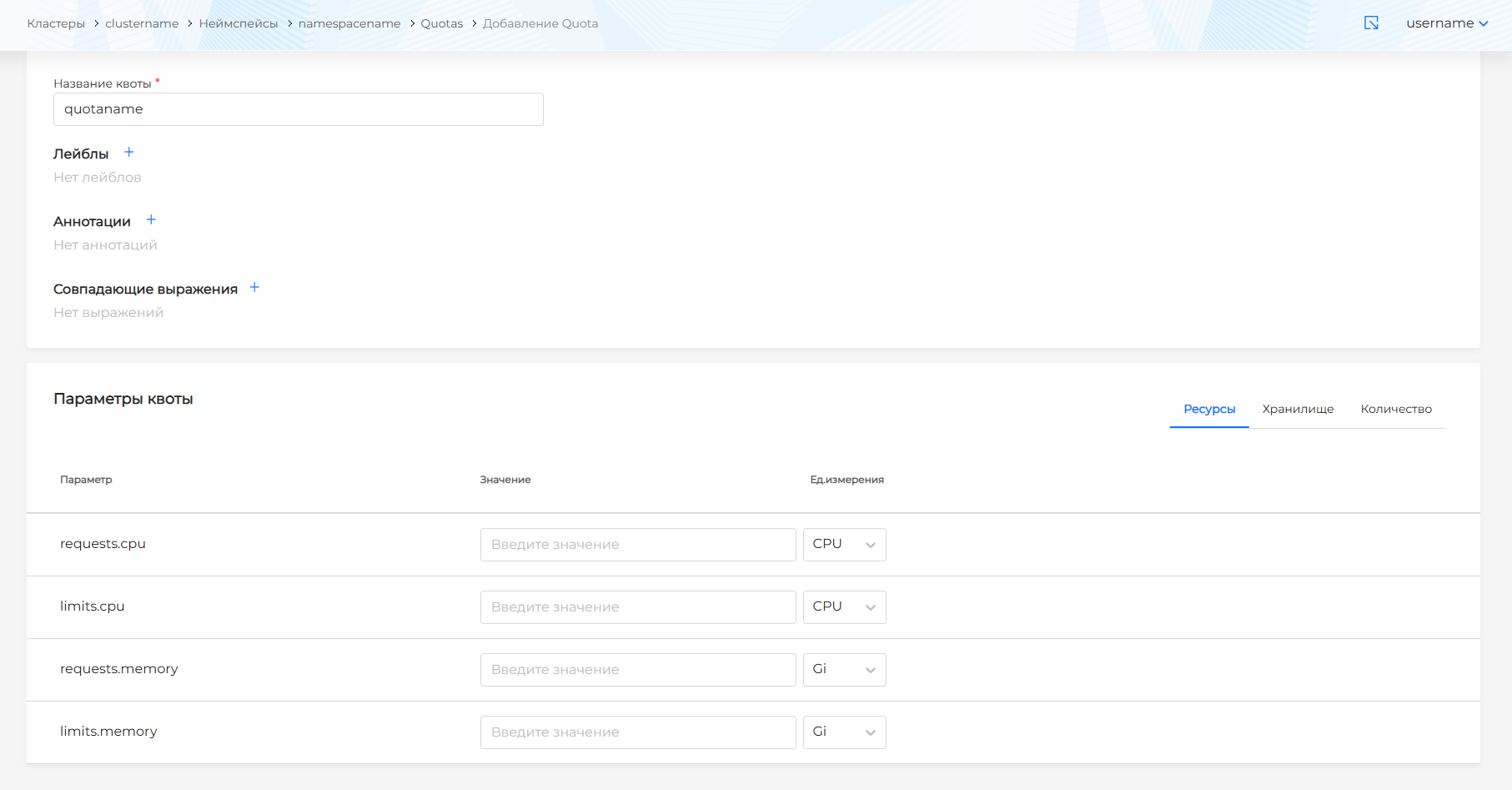 В открывшемся окне (рисунок 358) необходимо задать название квоты, при необходимости указать лейблы и аннотации. Для определения скоупа применения квоты требуется задать совпадающие выражения.