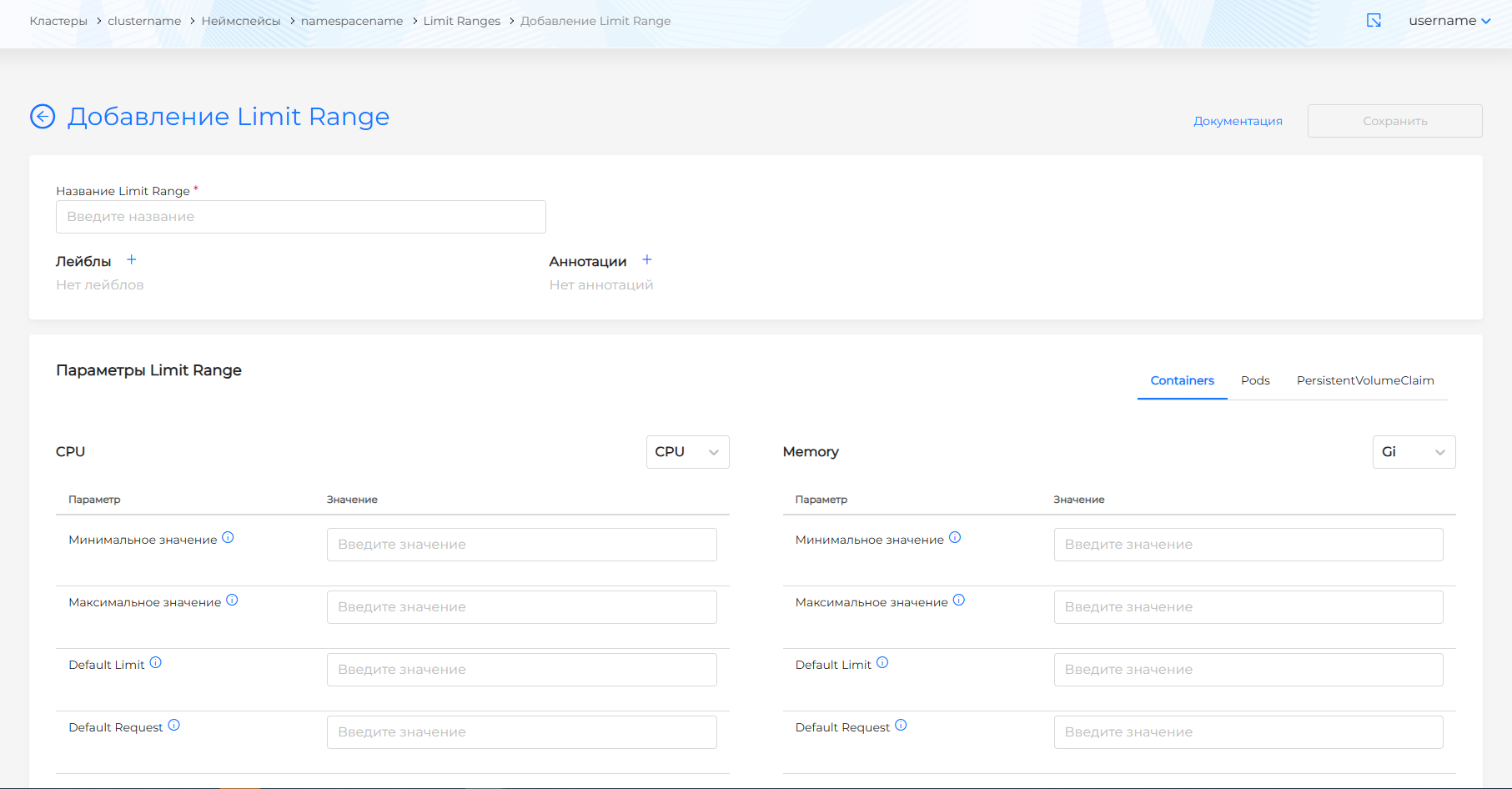 - CPU Минимальное значение (limits.min.cpu) означает, что на выбранных подах контейнер с CPU ниже указанного минимального значения параметра не будет запущен.