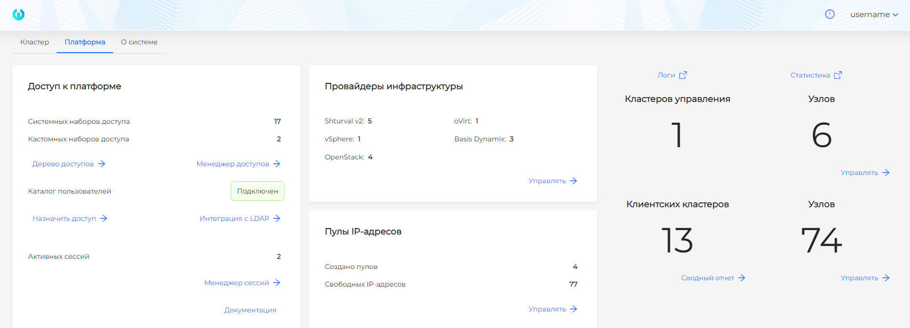 - Блок "Доступ к платформе" содержит сведения о том, сколько в Комплексе системных и кастомных наборов доступа, подключен ли внешний каталог пользователей, а также сколько в графическом интерфейсе активных сессий. Назначение прав доступа можно произвести на страницах управления доступом в кластерах.