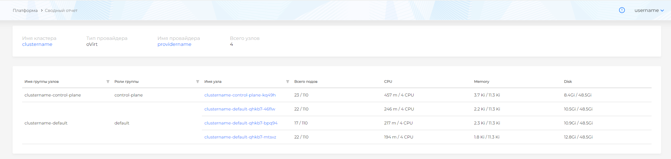 Если в кластерах установлен и работает модуль локального сбора метрик, а в кластере управления включен и работает модуль централизованного хранения метрик, то в сводном отчете по узлам будет представлена информация в виде отношения фактического использования показателя к выделенному.