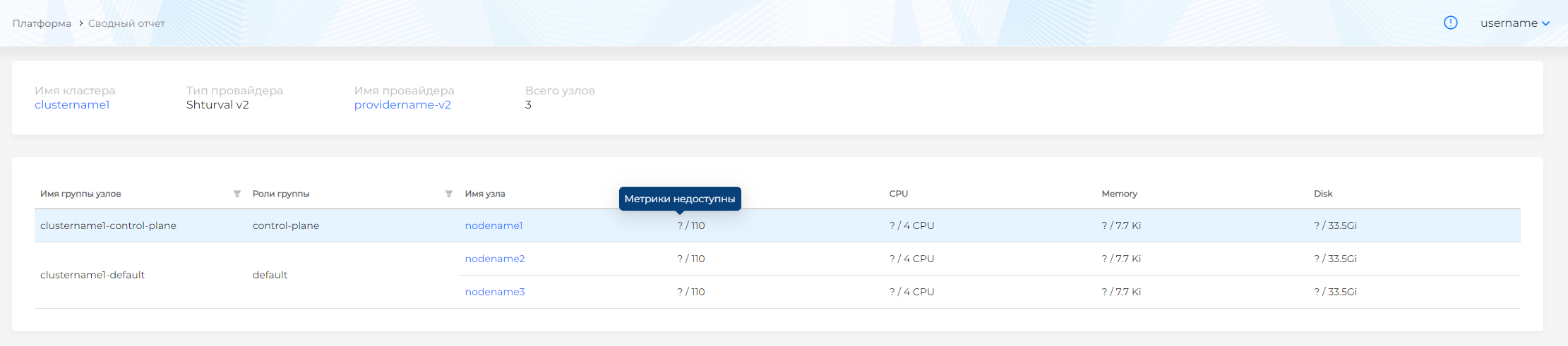 Если метрики недоступны, будет показан только запрошенный для узлов объем (рисунок 46).