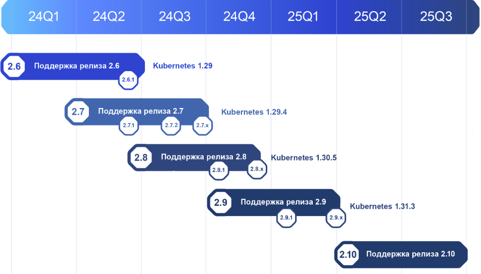 - минорная версия ‒ происходят значительные изменения: обновляется версия Kubernetes, могут быть изменены компоненты или версии компонентов;