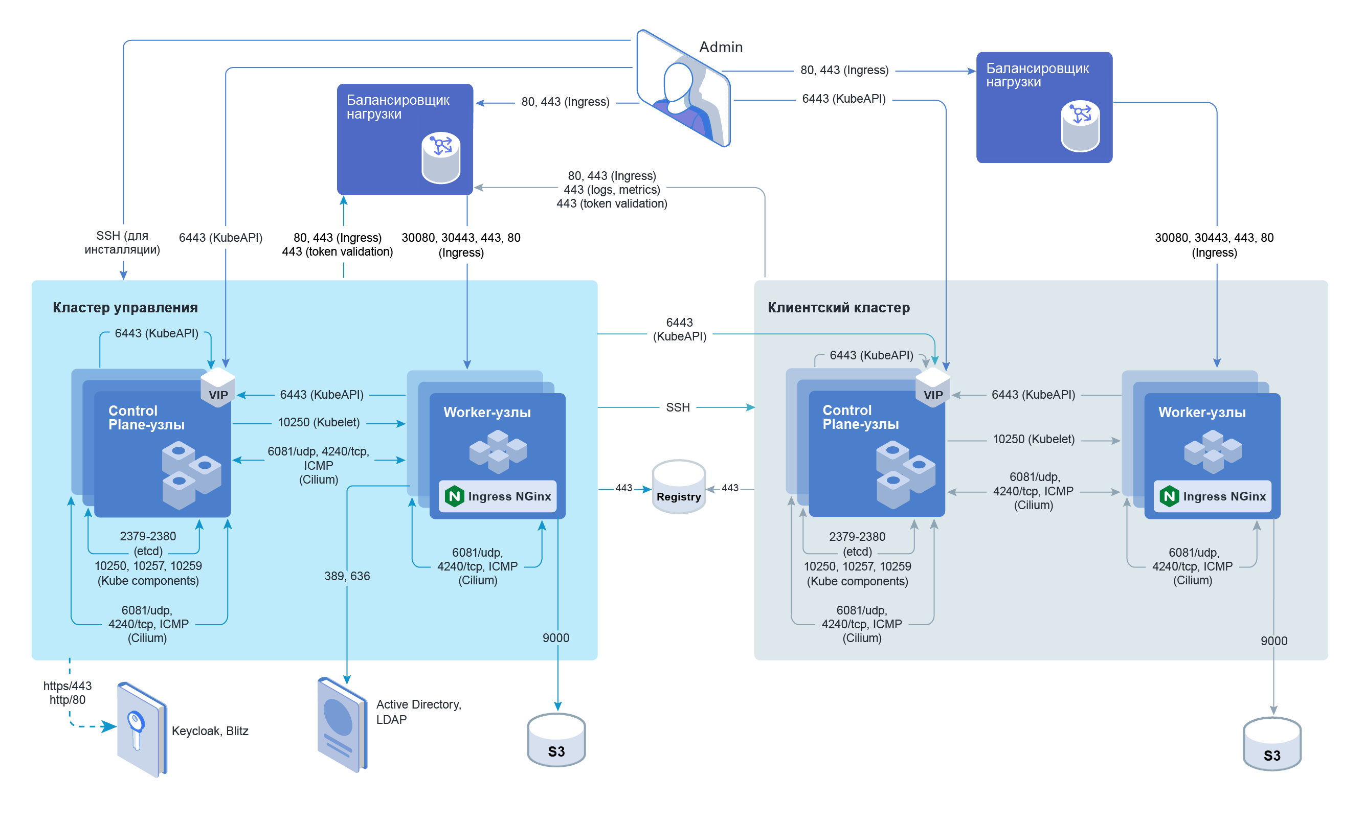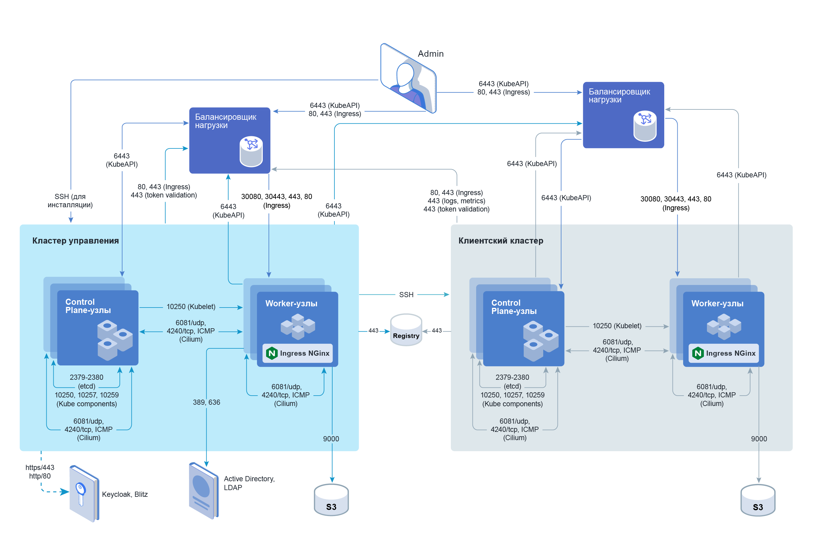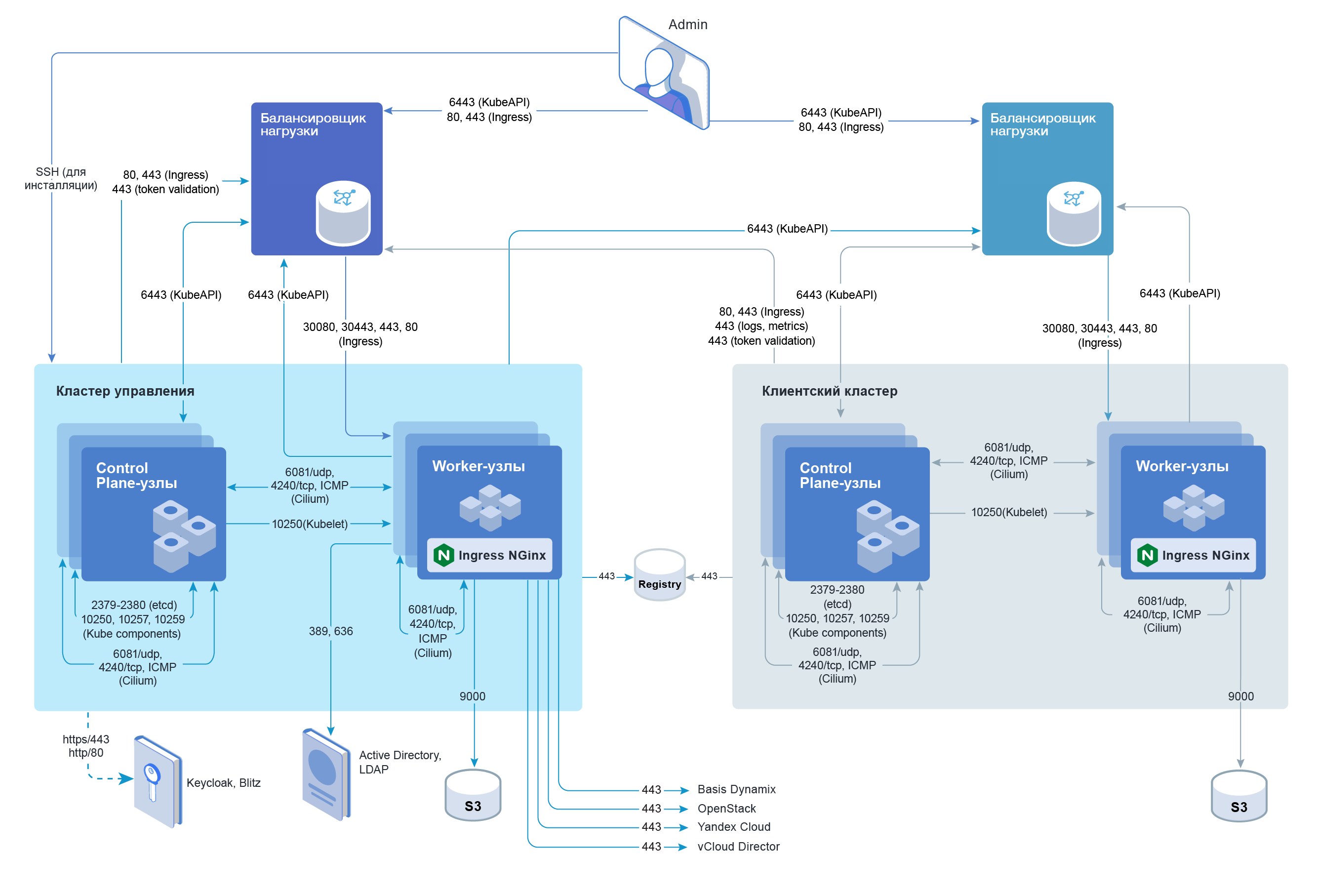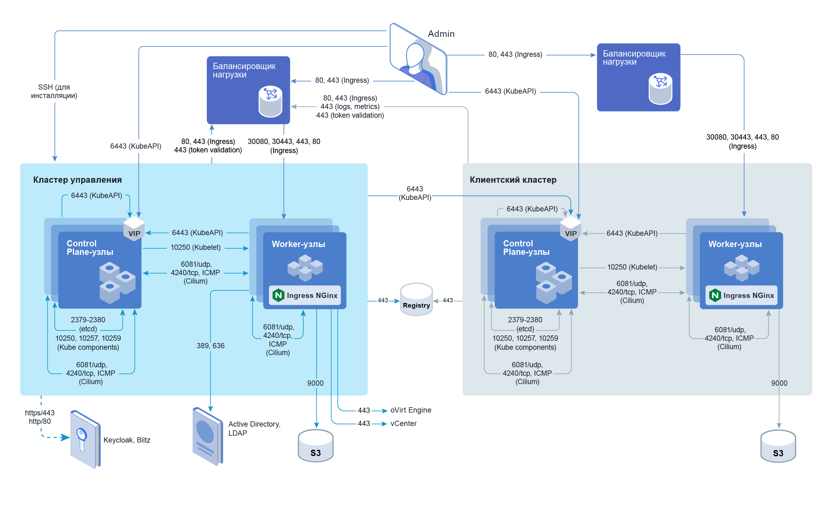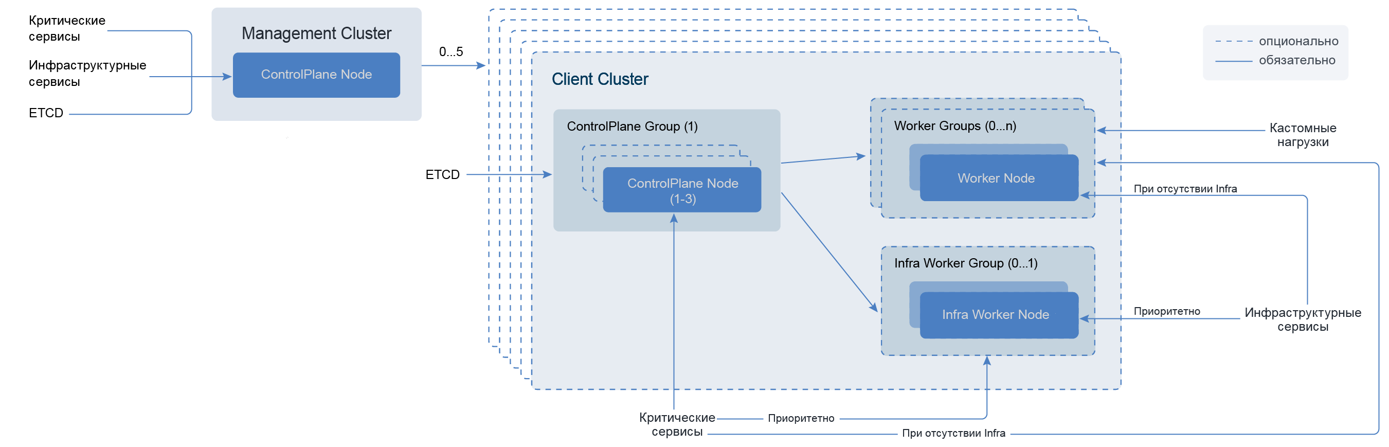 Клиентский кластер должен состоять как минимум из одного Control Plane-узла и одного Worker-узла. Для обеспечения отказоустойчивости кластер должен состоять как минимум из трех Control Plane-узлов и двух Worker-узлов. .
