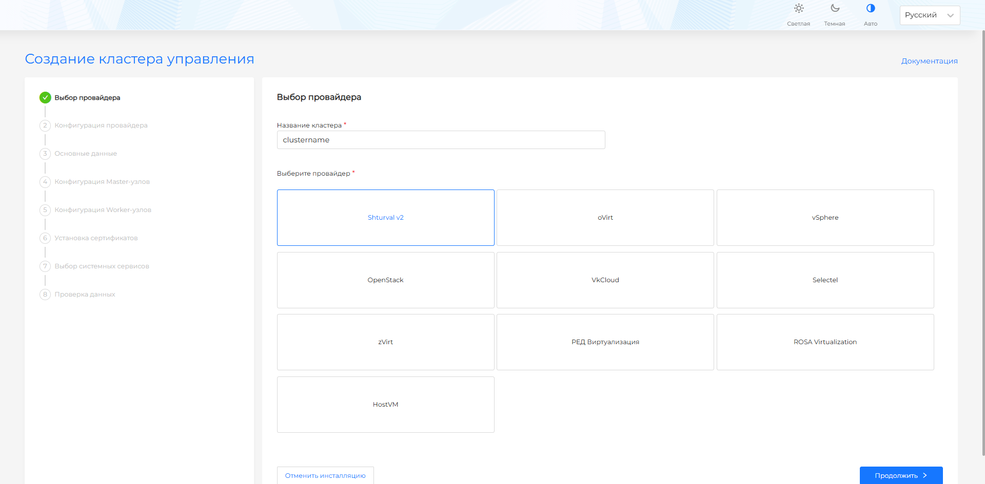 - При необходимости после установки можно добавить дополнительные узлы в провайдере Shturval v2, если кластер создан с провайдером Shturval v2, или для кластеров с провайдерами oVirt, vSphere масштабировать узлы в кластере управления для полнофункциональной эксплуатации.