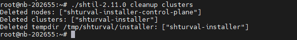 - Удаление постоянного кластера управления происходит только с временным кластером (bootstrap), поэтому, если временный кластер был удален или недоступен, в команде ./shtil-<номер_версии> delete management нужно указать лицензию (параметр --license) для поднятия временного кластера в открытом окружении или лицензию и Registry (параметры —license, --registry) в закрытом окружении.