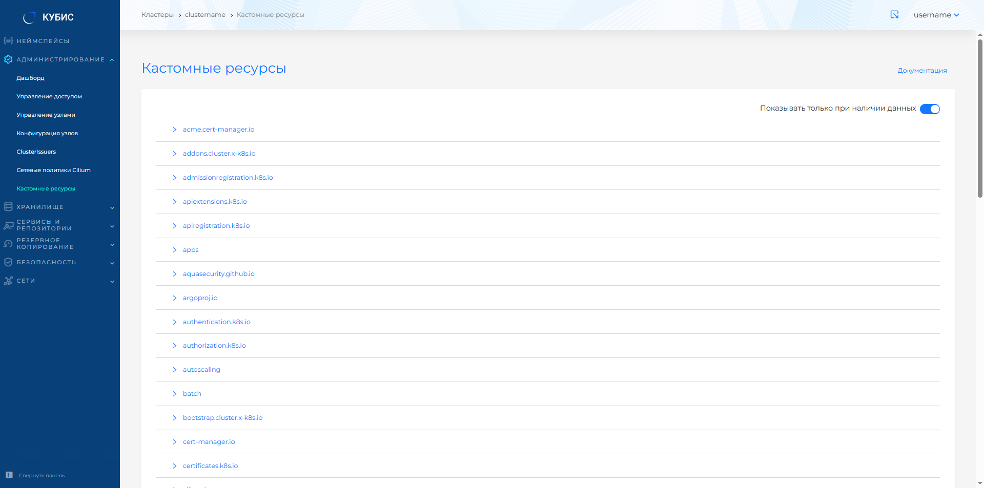 - Перейти в графический интерфейс кластера, открыть страницу "Кастомные ресурсы" раздела "Администрирование" (рисунок 19).