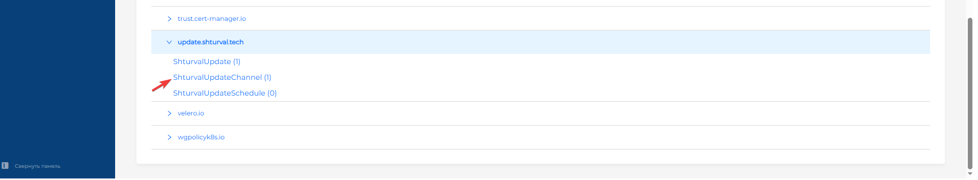 - Раскрыть API-группу update.shturval.tech и перейти к ShturvalUpdateChannel (рисунок 20); открыть манифест кастомного ресурса shturval-update (рисунок 21) и, ничего не изменяя, выполнить проверку, после нажать кнопку Сохранить (рисунок 22).