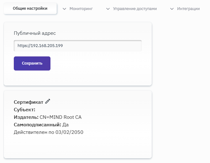 В разделе "Общие настройки" отображается форма для изменения публичного адреса Контроллера, создания новых самоподписанных сертификатов, замены существующих сертификатов на сертификаты от доверенного УЦ.