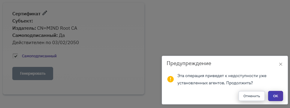 В открывшемся окне отобразится предупреждение о недоступности установленных агентов после генерации самоподписанного сертификата (рисунок 19). Необходимо нажать кнопку ОК.